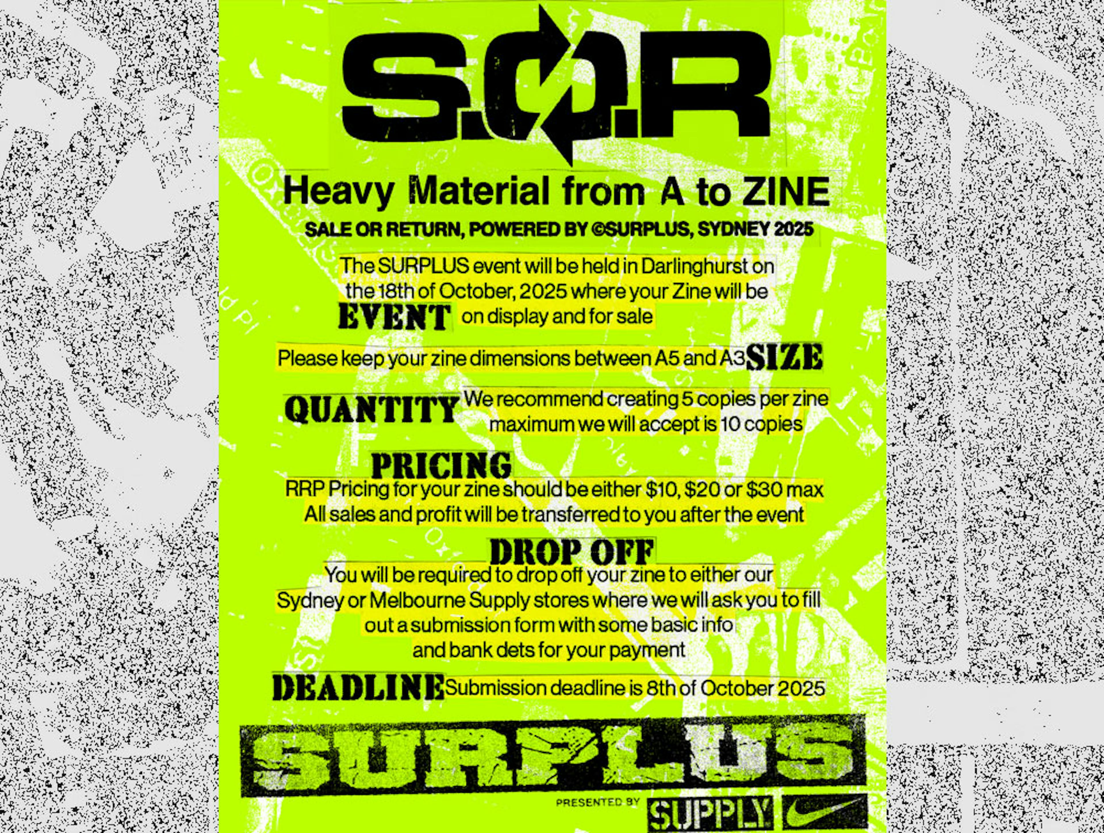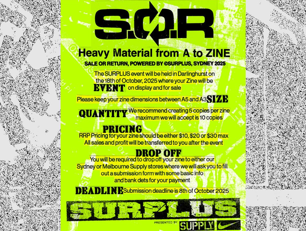 The SURPLUS® event will be held in Darlinghurst on the 18th of October, 2025 where your Zine will be on display and for sale.
